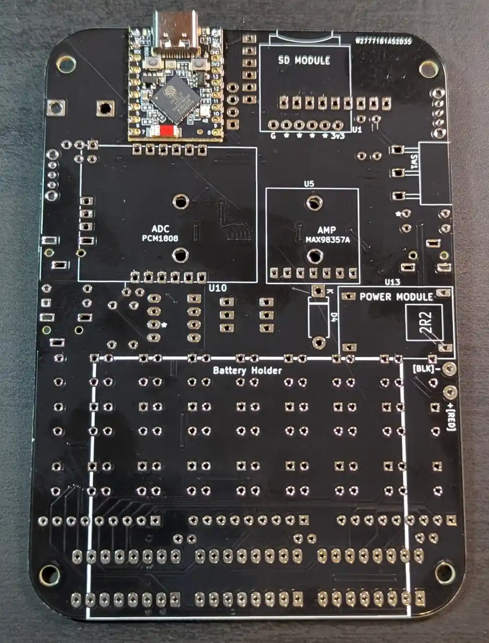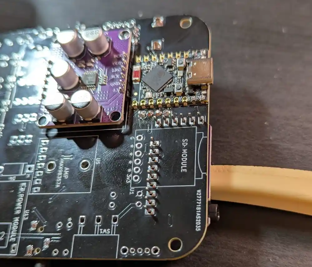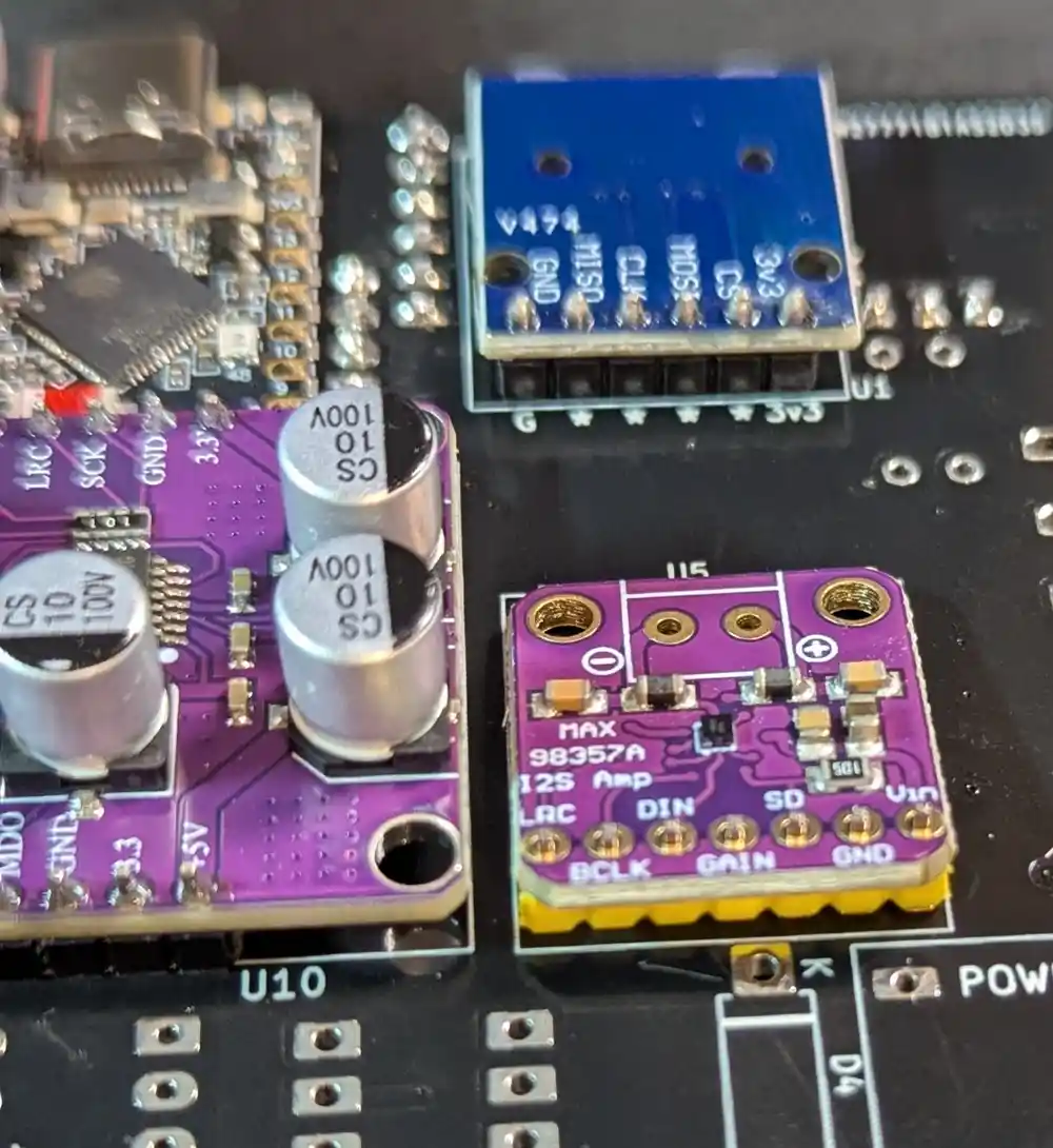 On the bottom of the board, we next add the MAX98357A amplifier module, then flip the board and solder the pins. Like the PCM5102, this converts digital I2S audio signals into analog signals to drive our built-in speaker.
