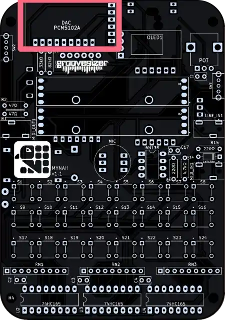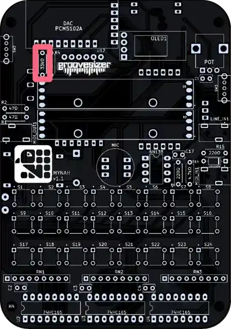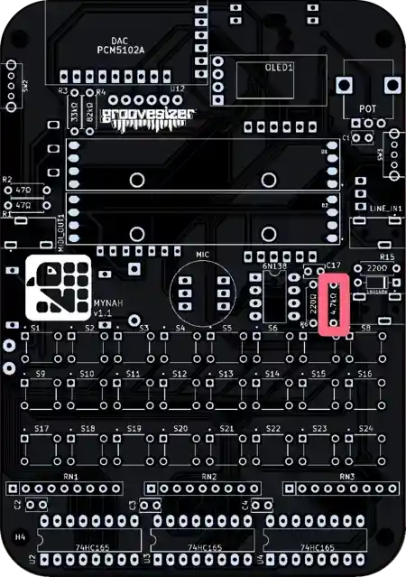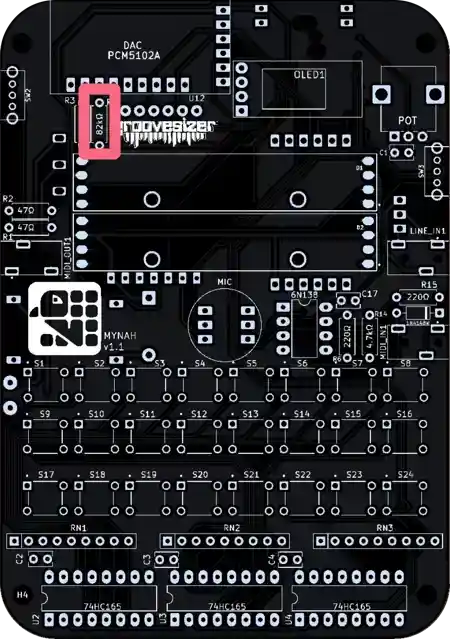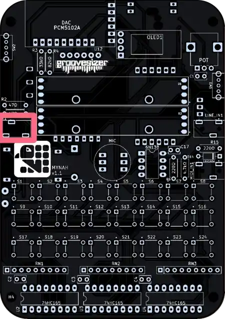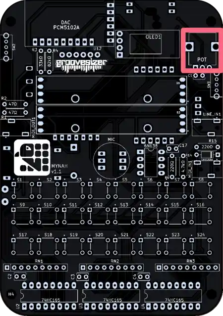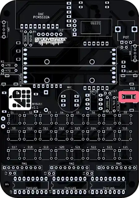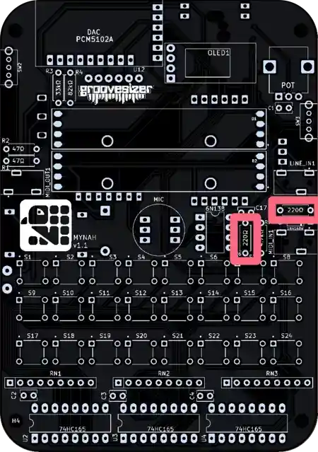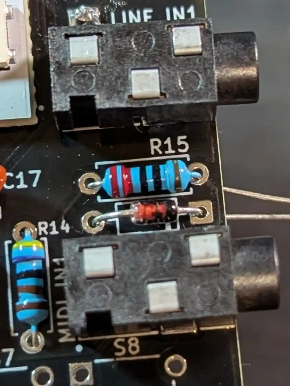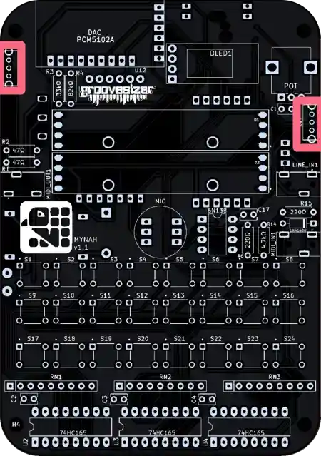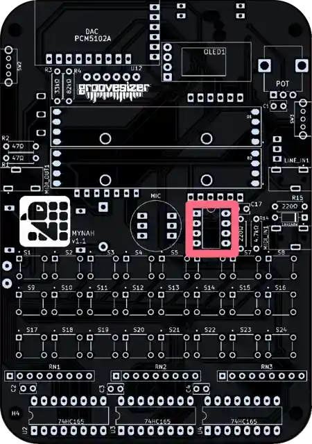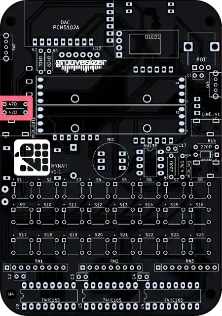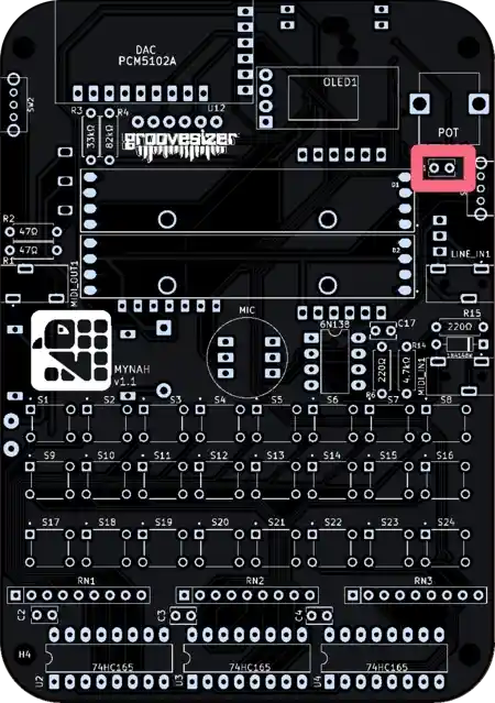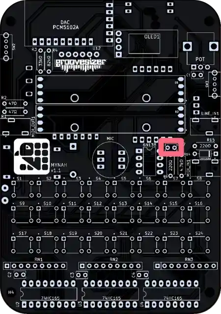 The one closest to the potentiometer is our line input, and the one below it is the MIDI input. They’re marked MIDI_IN1 and LINE_IN1 on the PCB.