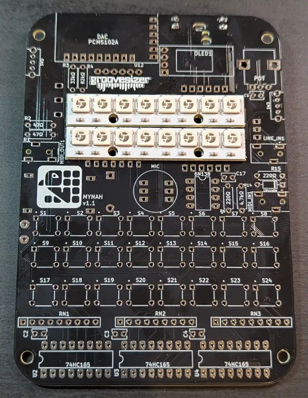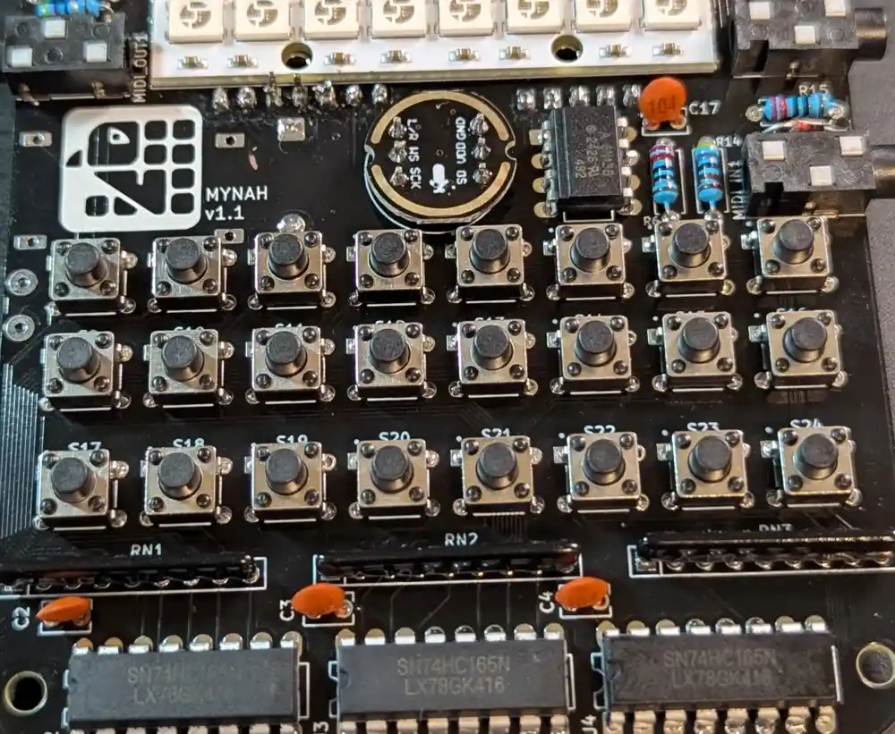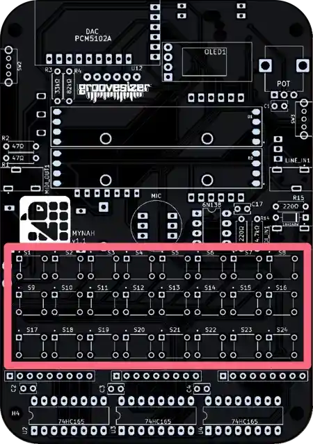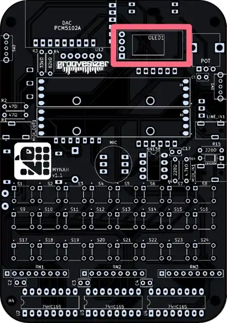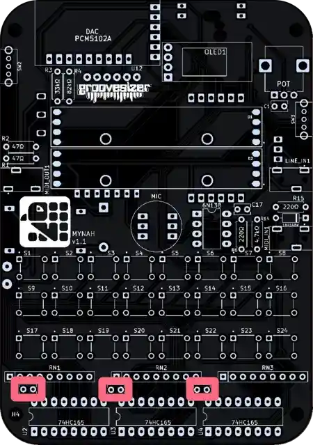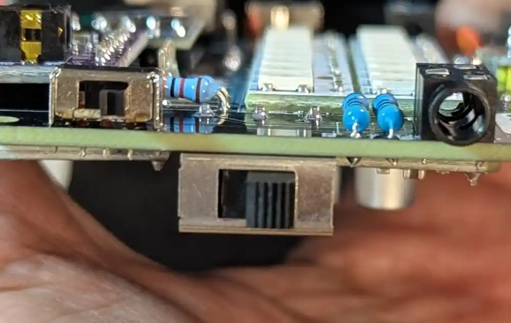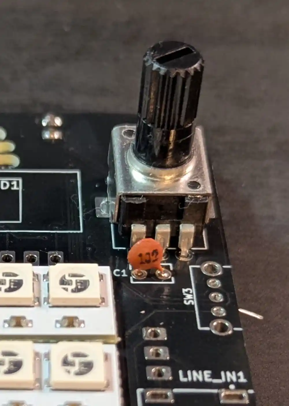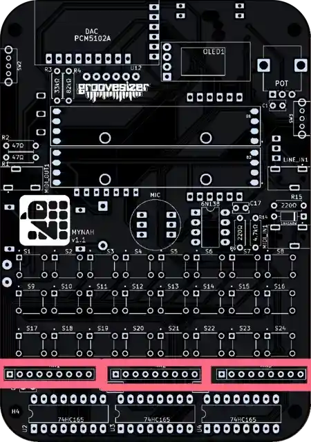 The one closest to the potentiometer is our line input, and the one below it is the MIDI input. They’re marked MIDI_IN1 and LINE_IN1 on the PCB.