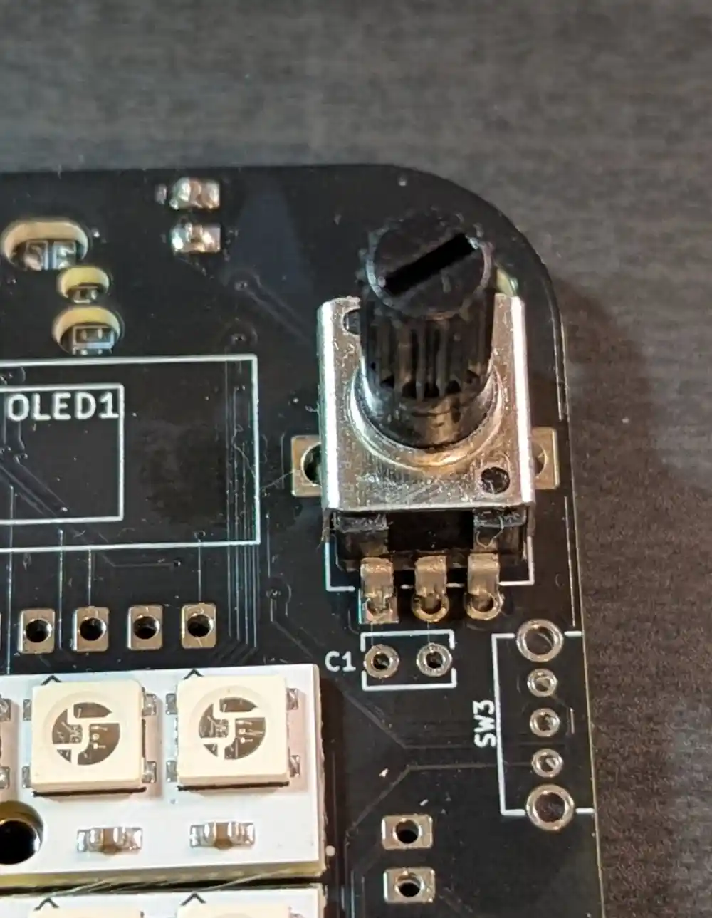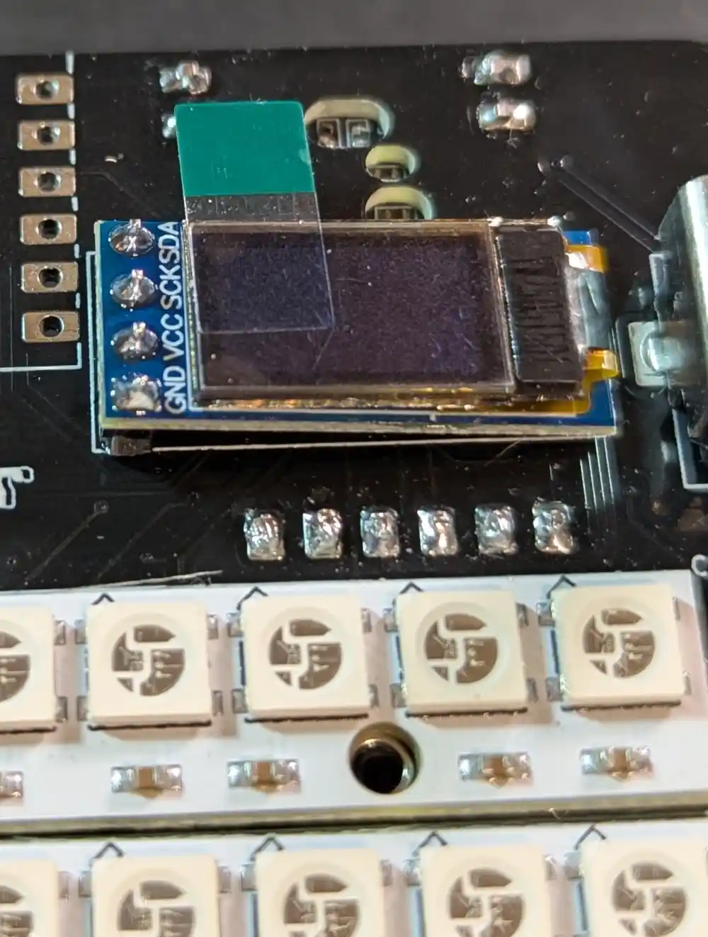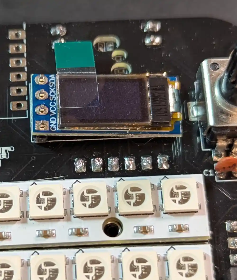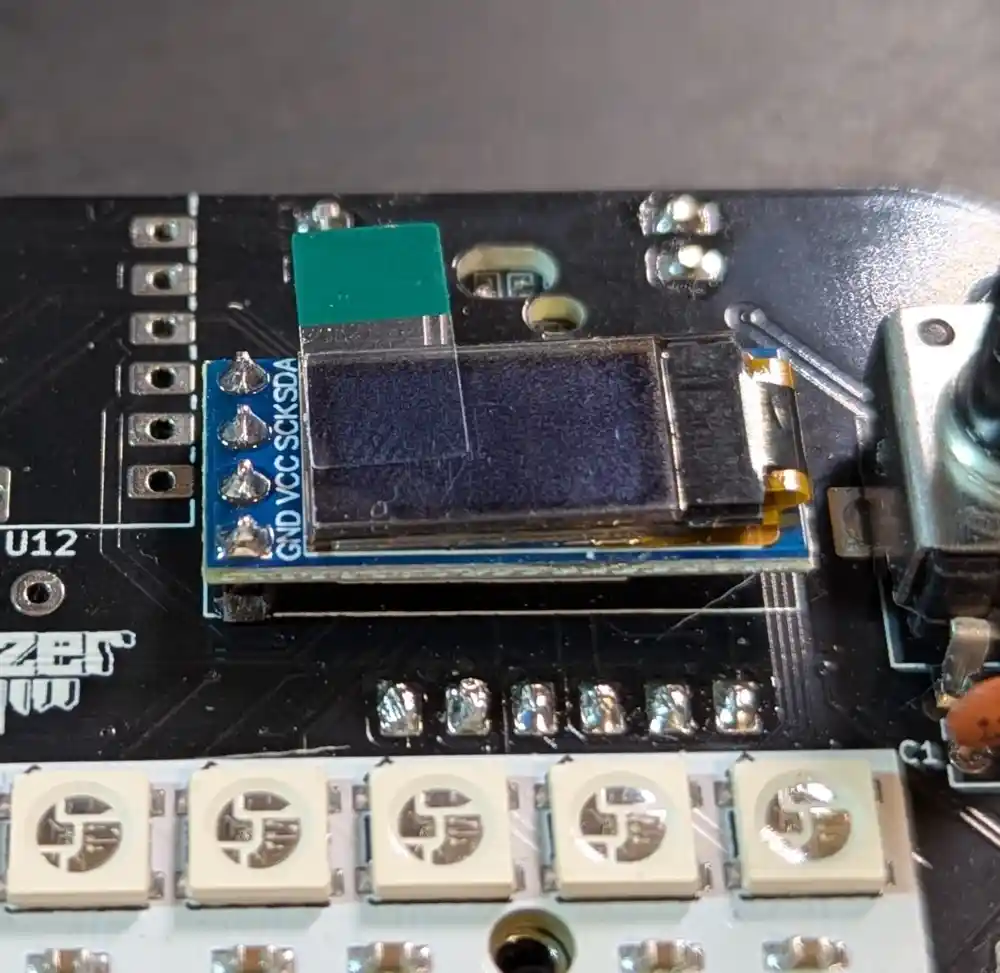 Let’s solder the OLED to its header on the top of the board, ensuring that the OLED PCB is flush against the header. Since it’s not soldered to the main PCB yet, it’s going to lean to the right side.