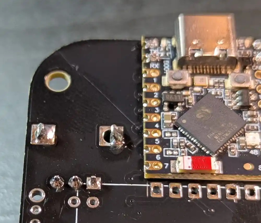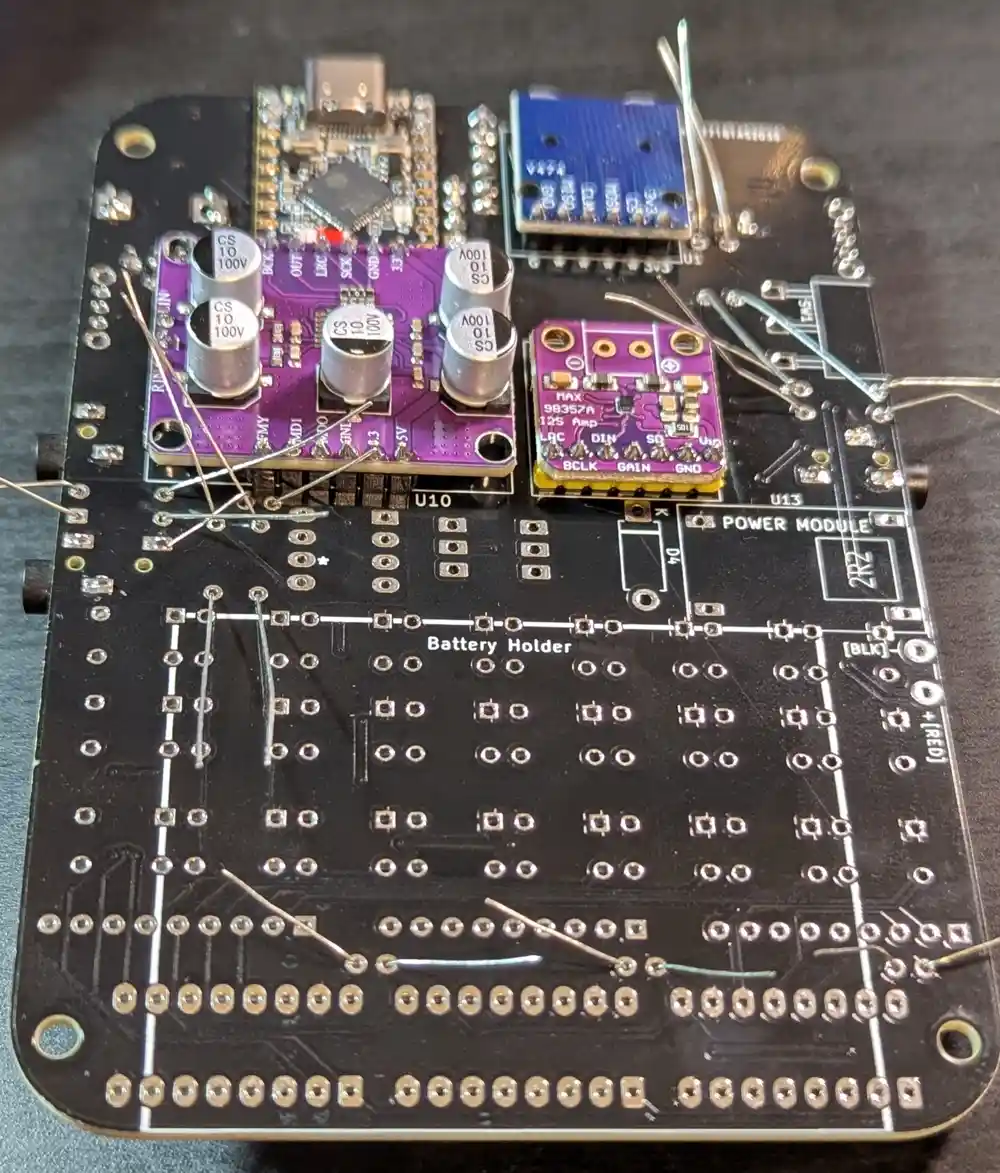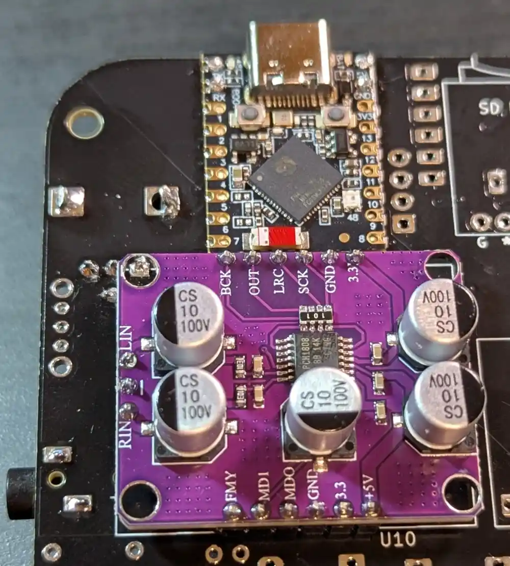 And here’s the bottom. The ESP32-S3 SuperMini board (the Mynah’s brain) has been pre-soldered. In addition to the pads on the sides of the microcontroller PCB, there are also a number of blind pads on the bottom, requiring the microcontroller to be soldered using a hot plate.