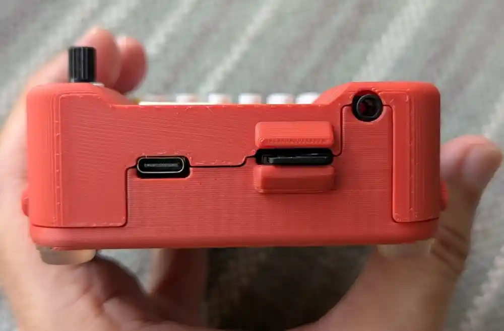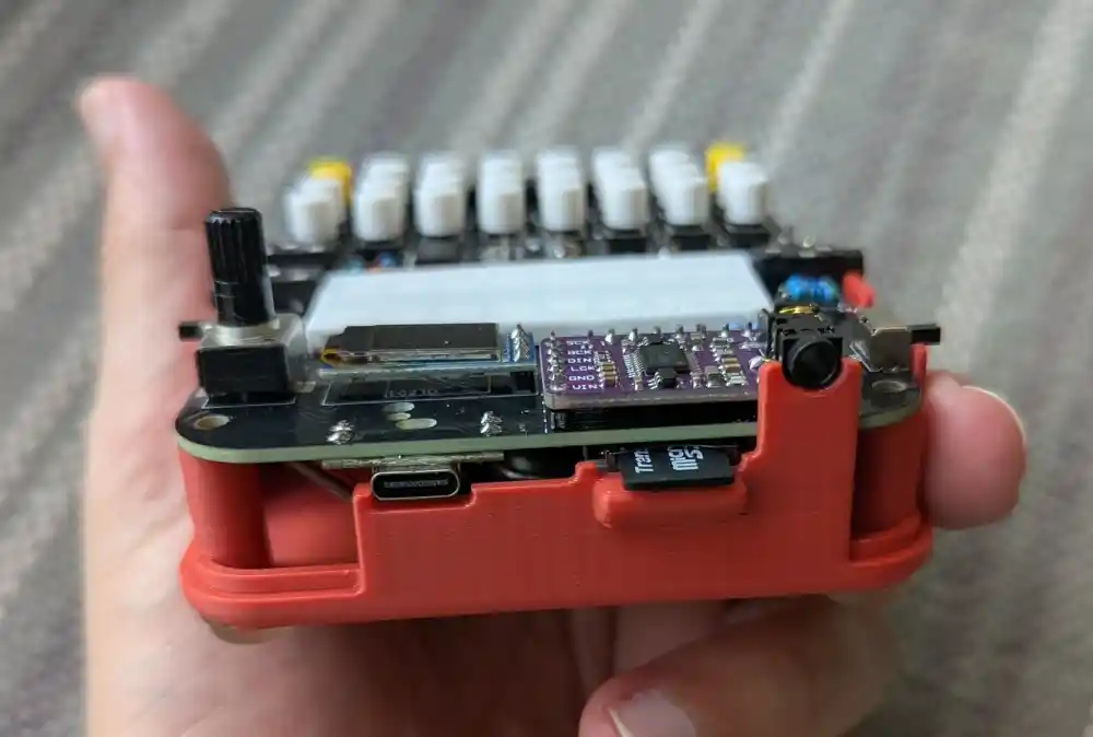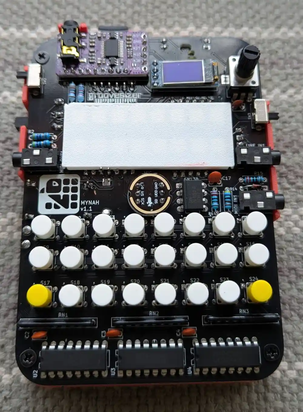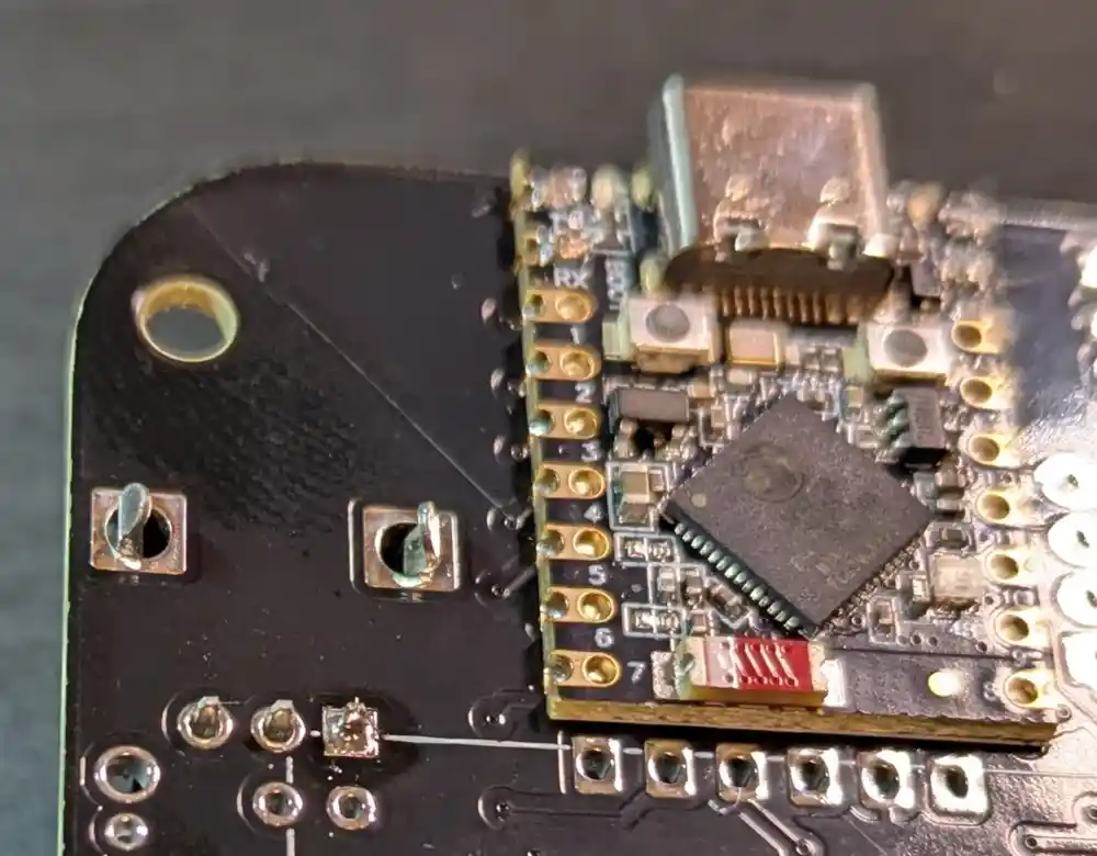 And here’s the bottom. The ESP32-S3 SuperMini board (the Mynah’s brain) has been pre-soldered. In addition to the pads on the sides of the microcontroller PCB, there are also a number of blind pads on the bottom, requiring the microcontroller to be soldered using a hot plate.