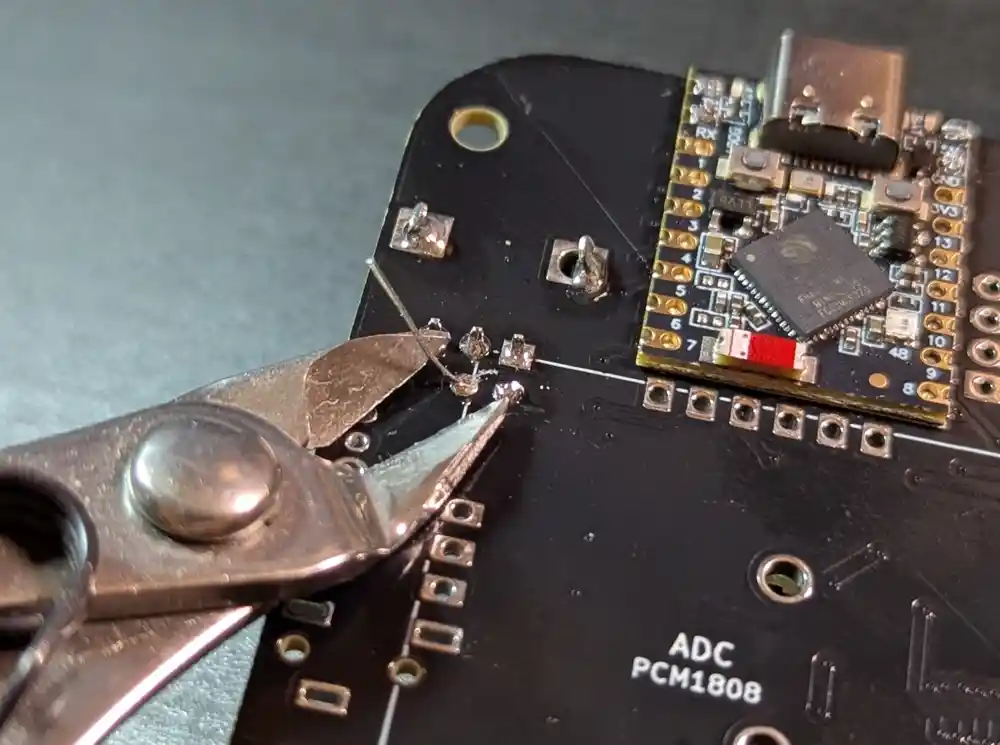 Let’s flip the board over, solder the leads, then snip off the excess with our edge cutters. Double-check the solder joints at this point, as they will sit under the PCM1808 PCB later on and will be hard to reach.
