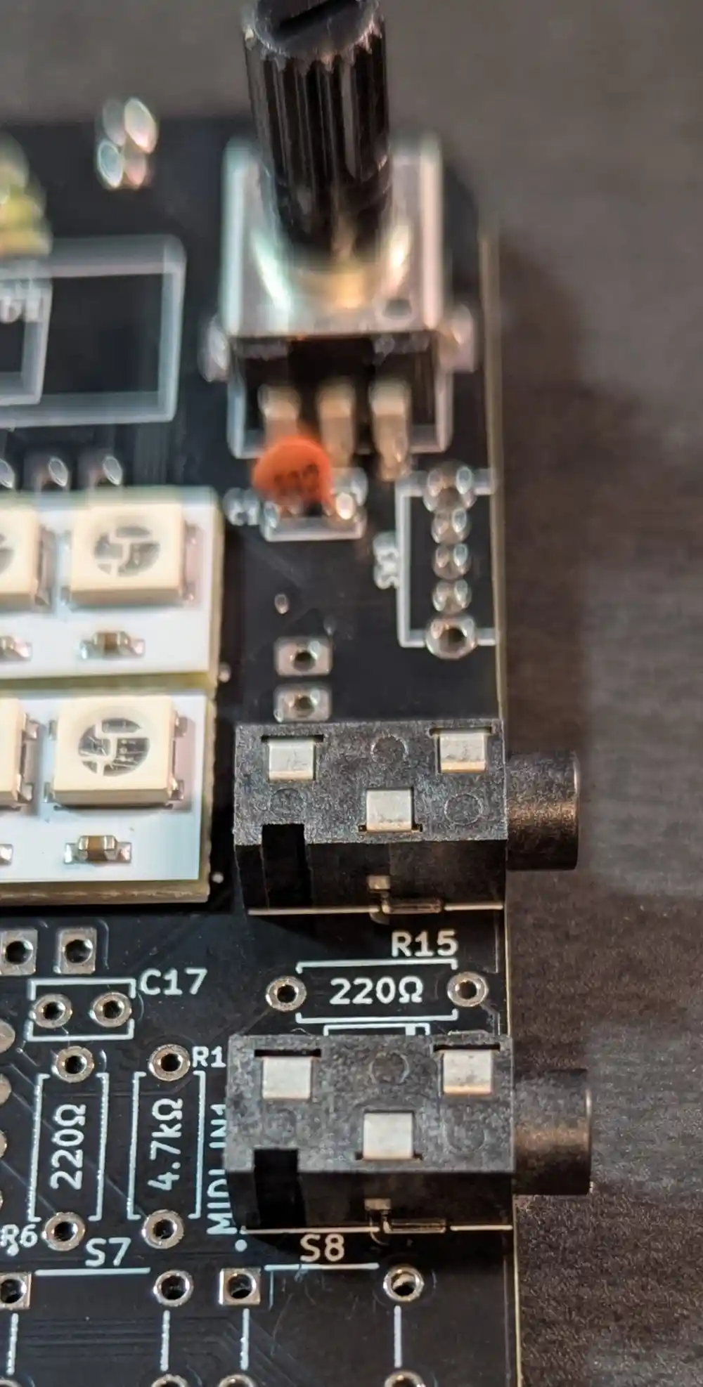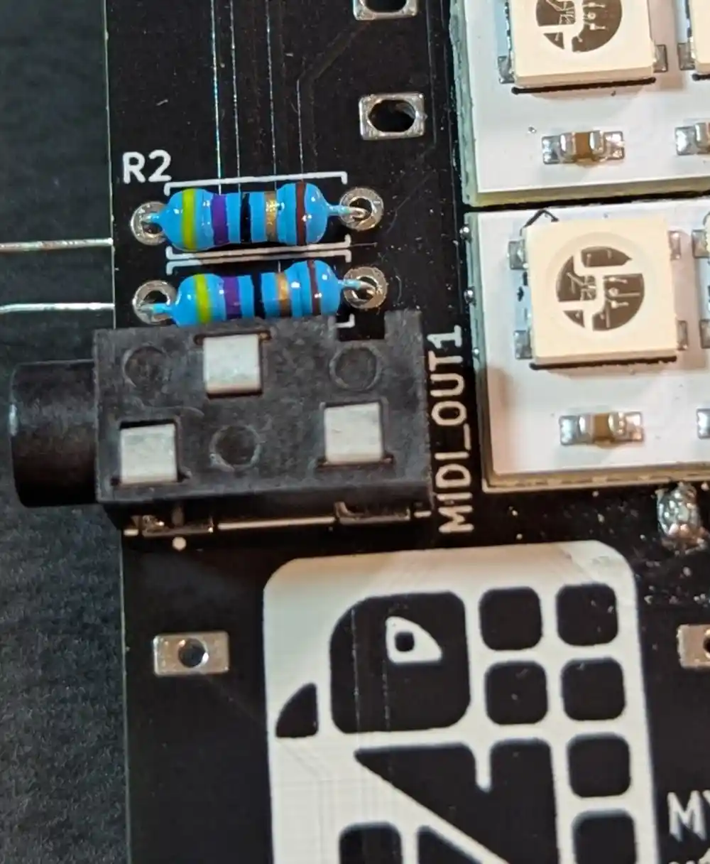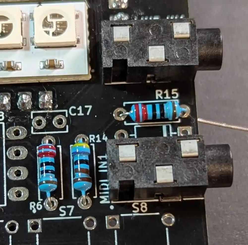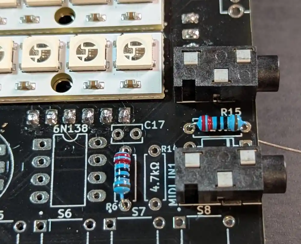 We also populate the 4.7kΩ resistor required for MIDI-in – the 5-band color code is Yellow-Violet-Black-Brown-Brown.