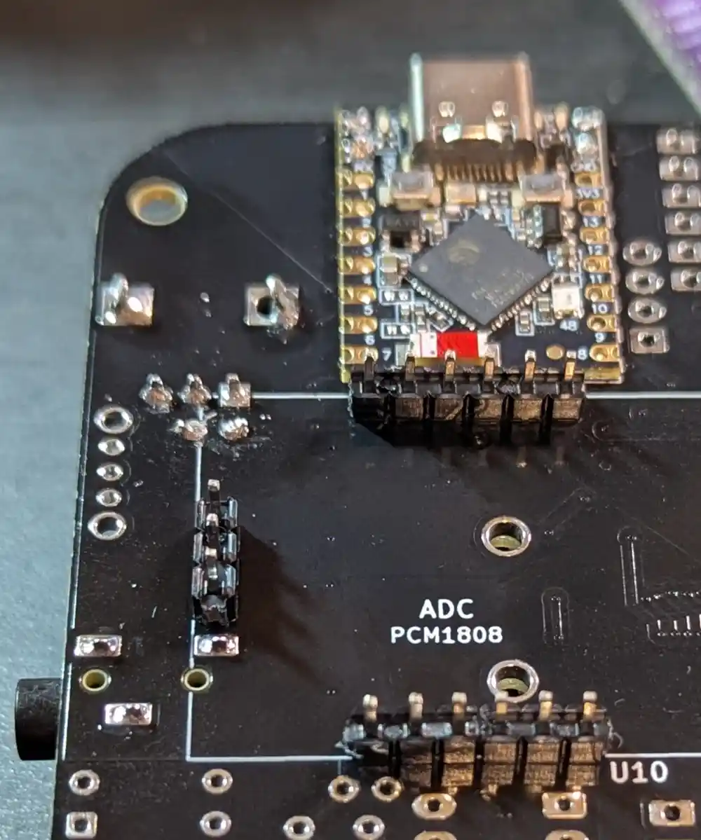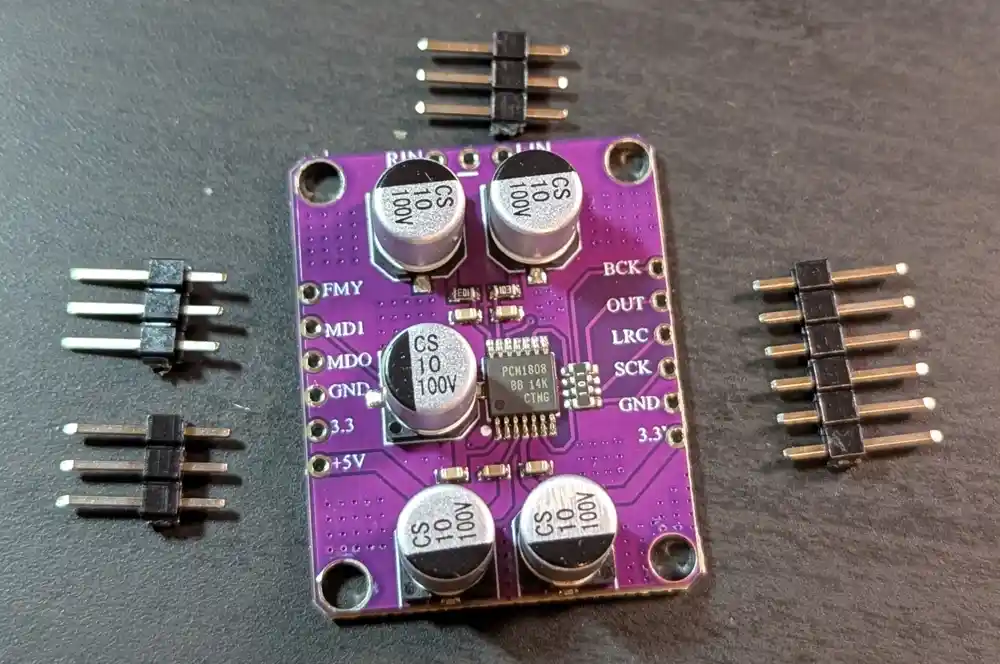The PCM1808 module handles audio arriving via our line input – it’s an analog-to-digital convertor (ADC) that converts analog audio into digital I2S signals. First, we want to snip the headers to the correct lengths.
