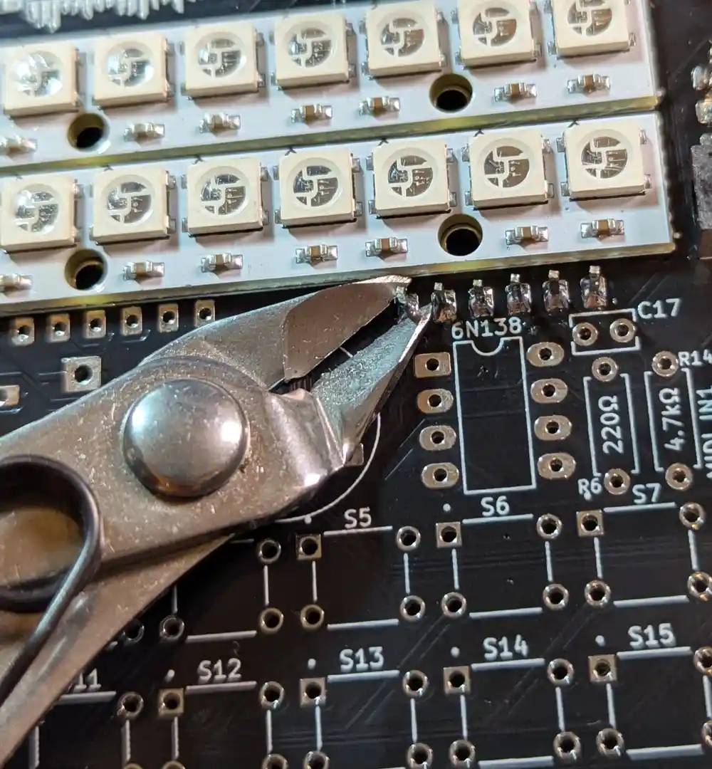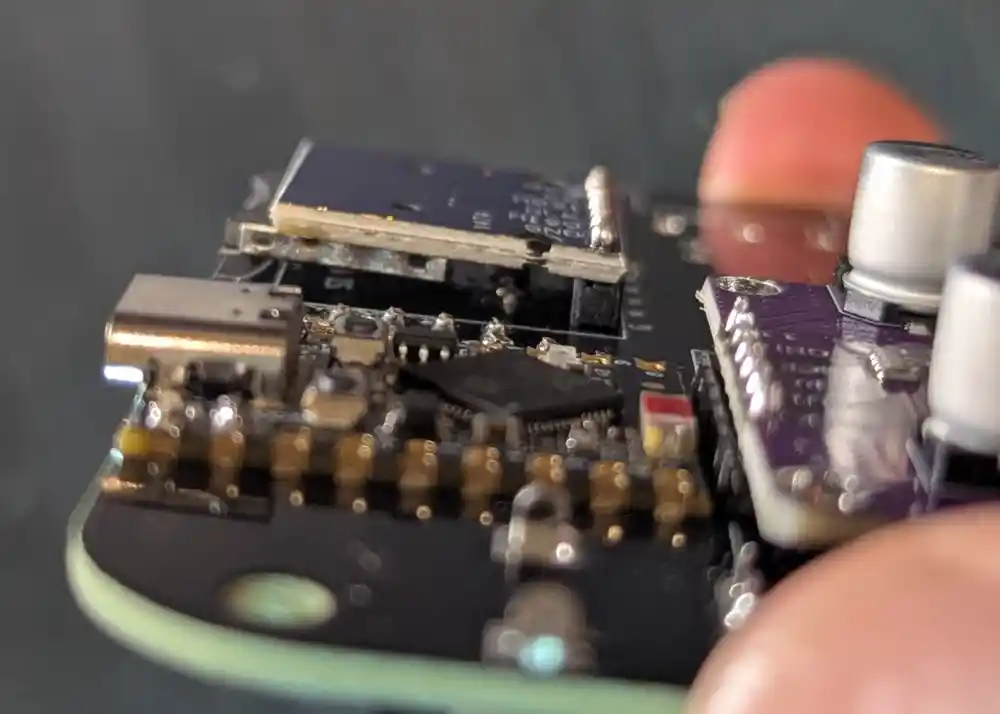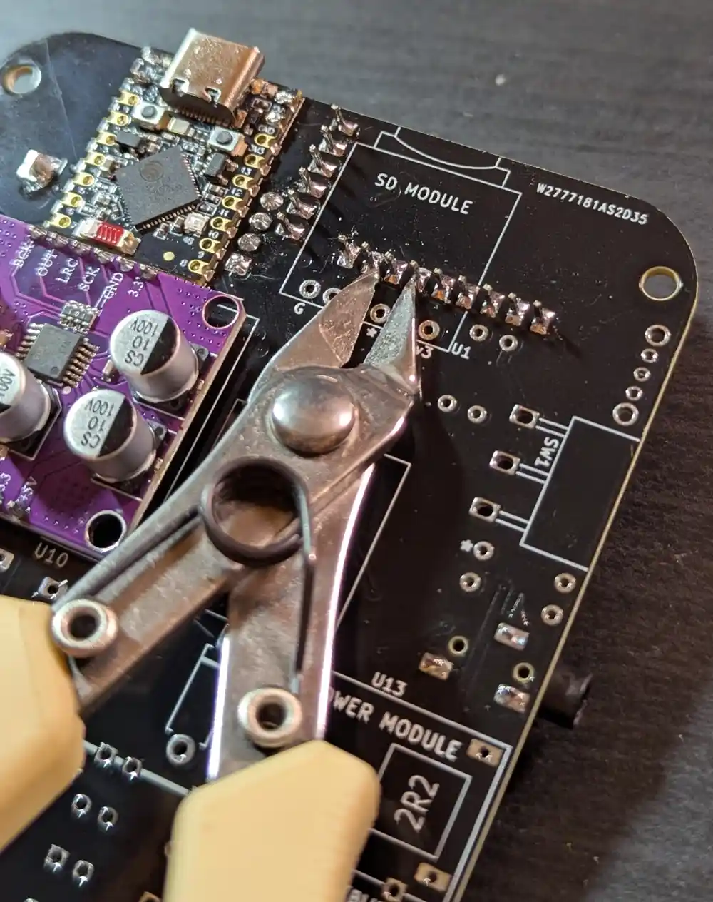 After flipping the board and soldering the module’s pins on the top side of the board, we can snip off the excess with our edge cutters. This will give us more room to maneuver later.