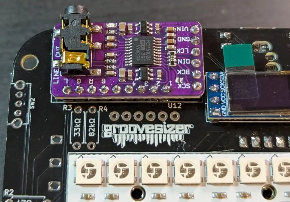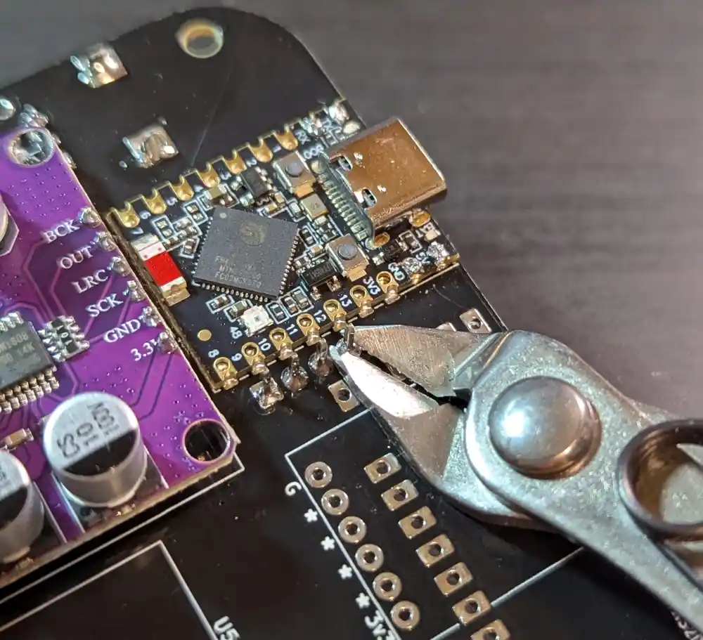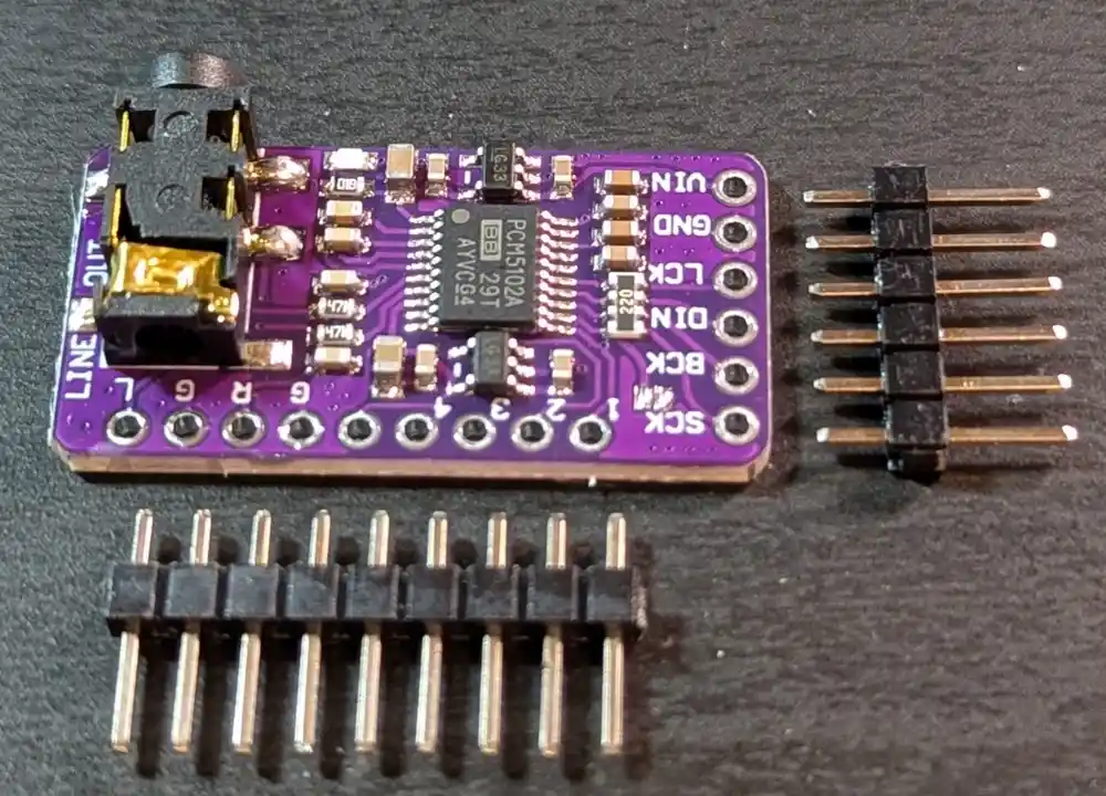 The PCM5102 converts digital I2S audio signals from the microcontroller into high-quality analog signals to drive the Mynah’s output. As with the PCM1808, we want to cut the provided headers to the correct length.