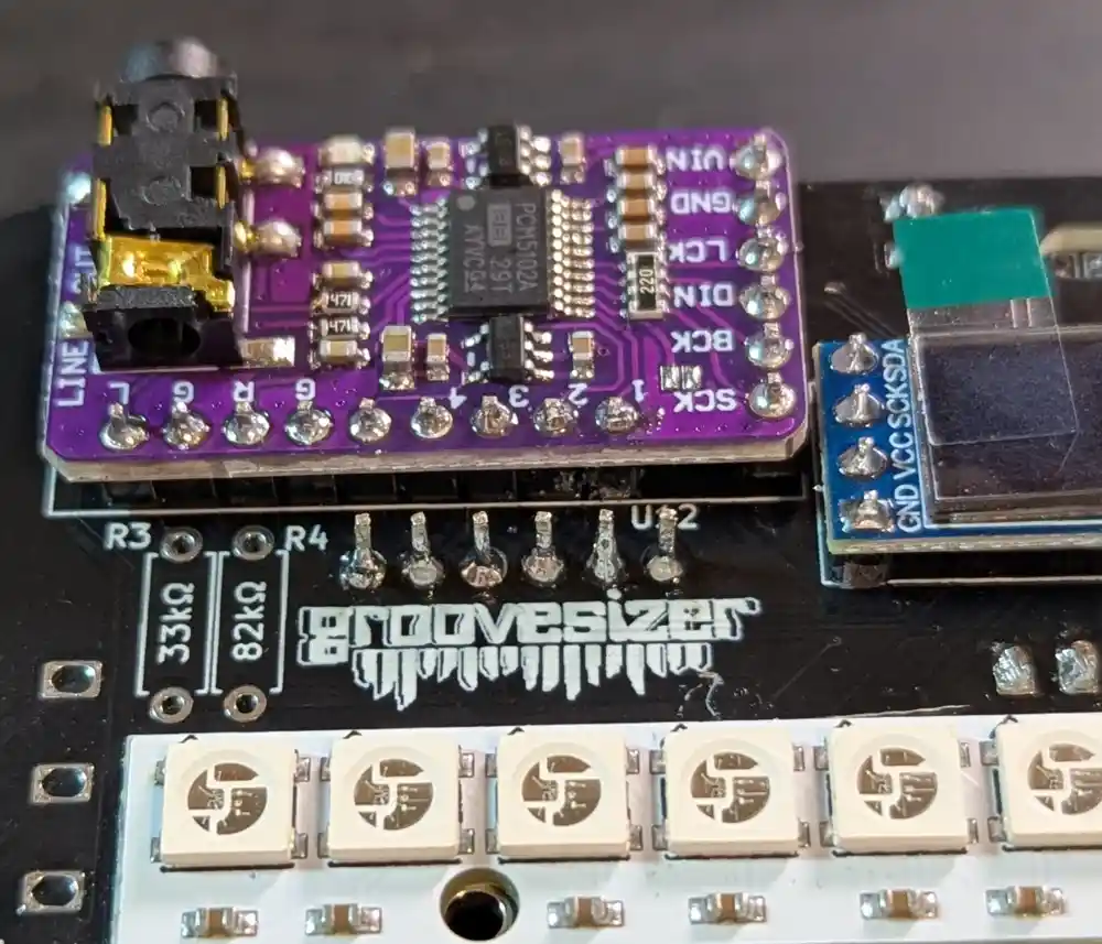 We insert it on the top of the board, then solder the pin headers to the PCM5102’s PCB.