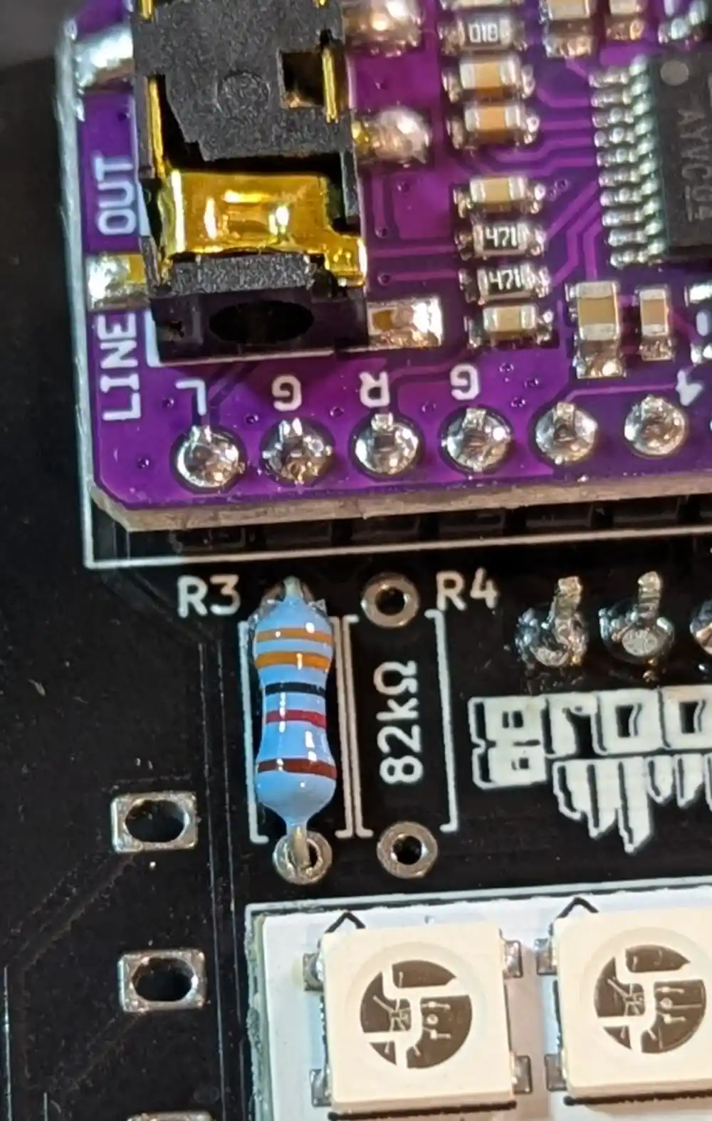 Finally we add the 82kΩ resistor next to it (labeled R4)- the 5-band color code is Grey-Red-Black-Red-Brown.