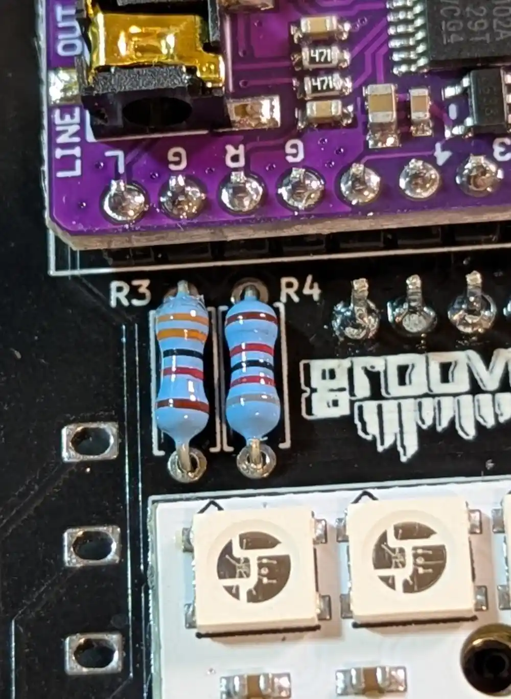 Next we populate the two 47Ω resistor required for MIDI-output – the 5-band color code is Yellow-Violet-Black-Gold-Brown.