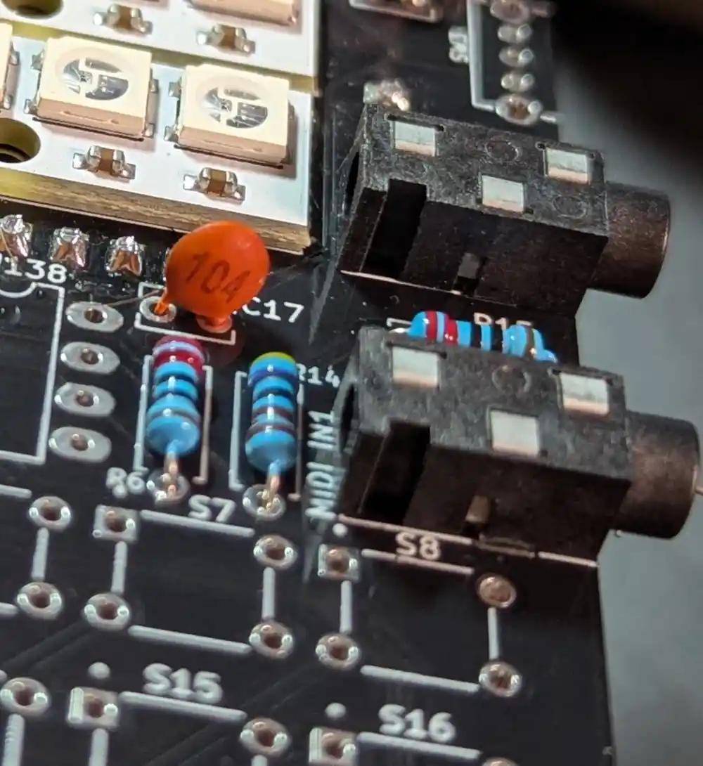 Before we solder, let’s also add the 100nF cap for the MIDI input circuit (it’s marked 104) – either way around is fine
