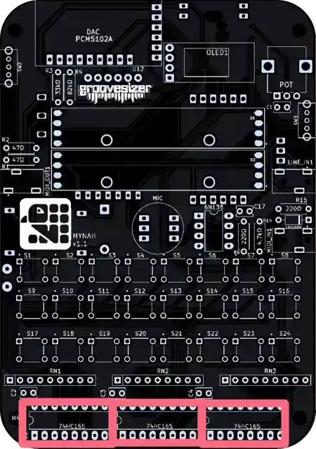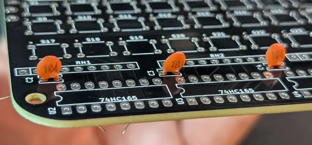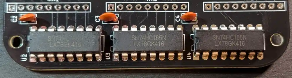 And let’s also add the 3 100nF caps that serve as decoupling caps for the 74HC165 ICs.