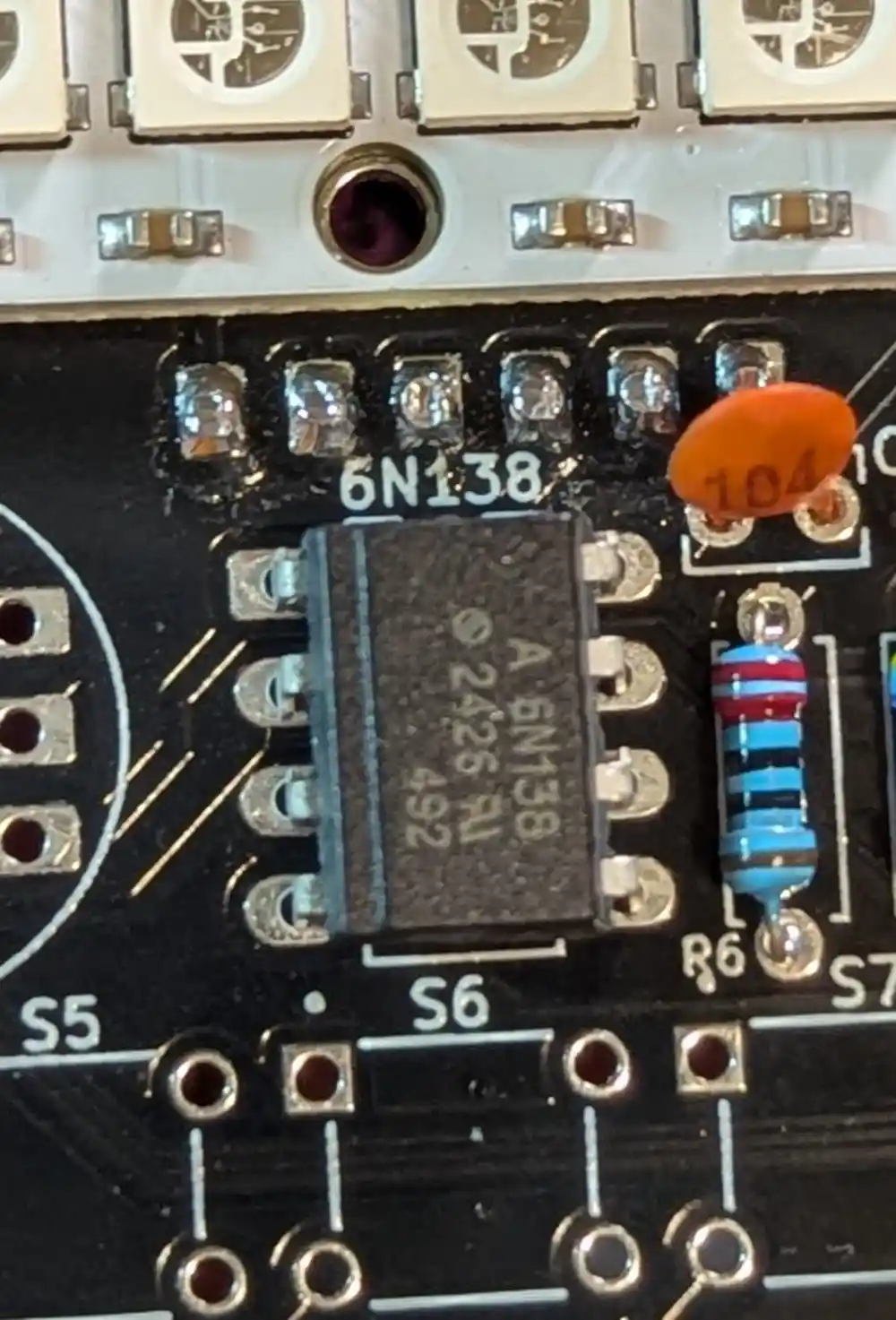 The footprint is marked 6N138 on the top of the board. Be careful with the orientation – pin 1 is top left with the square pad. In this case, the beveled edge should be on the left. After triple checking the orientation, flip and solder.