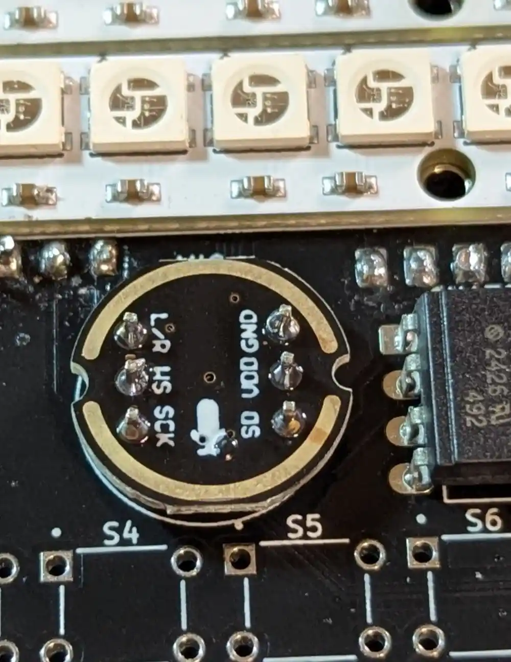 Orientation is important here, too. The GND pin is located top right. Do ensure the the MIC module is flush with the headers and the headers are flush with the PCB when soldering.
