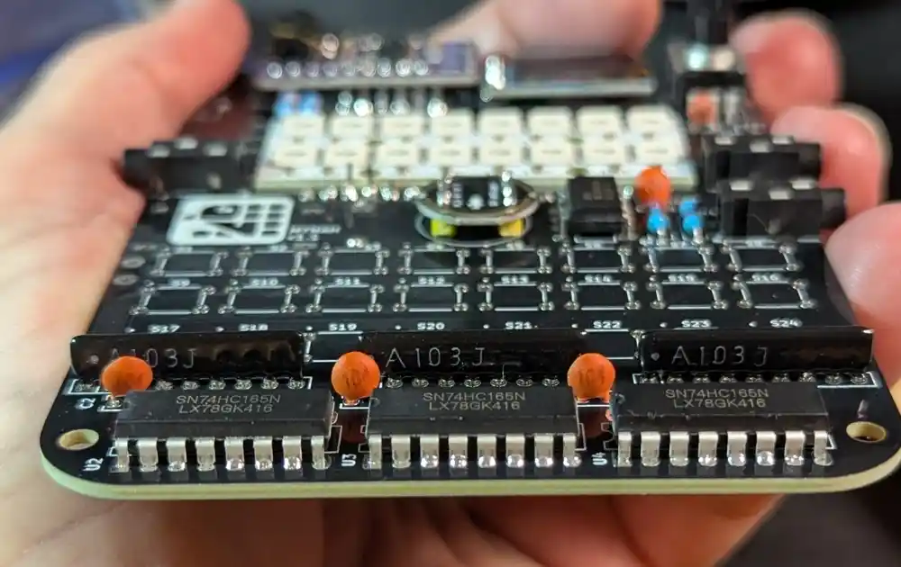 The 3 shift register ICs allows us to read all 24 button inputs with only 3 pins on the ESP32. The orientation is important. The notch in the casing should be on the left. Flip and solder.