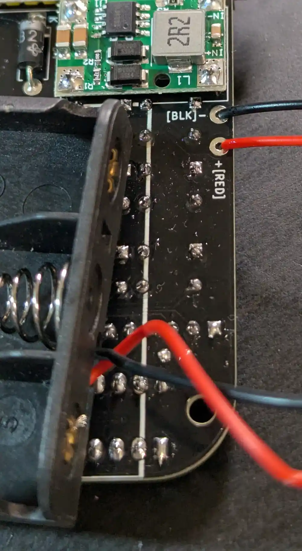 On the bottom of the PCB. let’s solder the battery holder leads to the PCB.