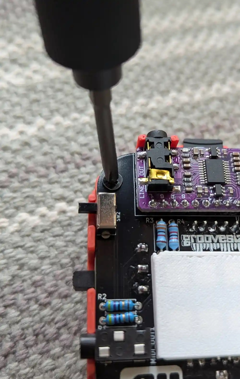 To solder the module on the bottom of the board, you may want to prop it up with the handle of your edge cutters to prevent it from falling out. Again, one leg first, ensure it’s flush and straight, then solder the remaining legs. The alignment is important as the audio ouput jack needs to fit the hole in the enclosure later.