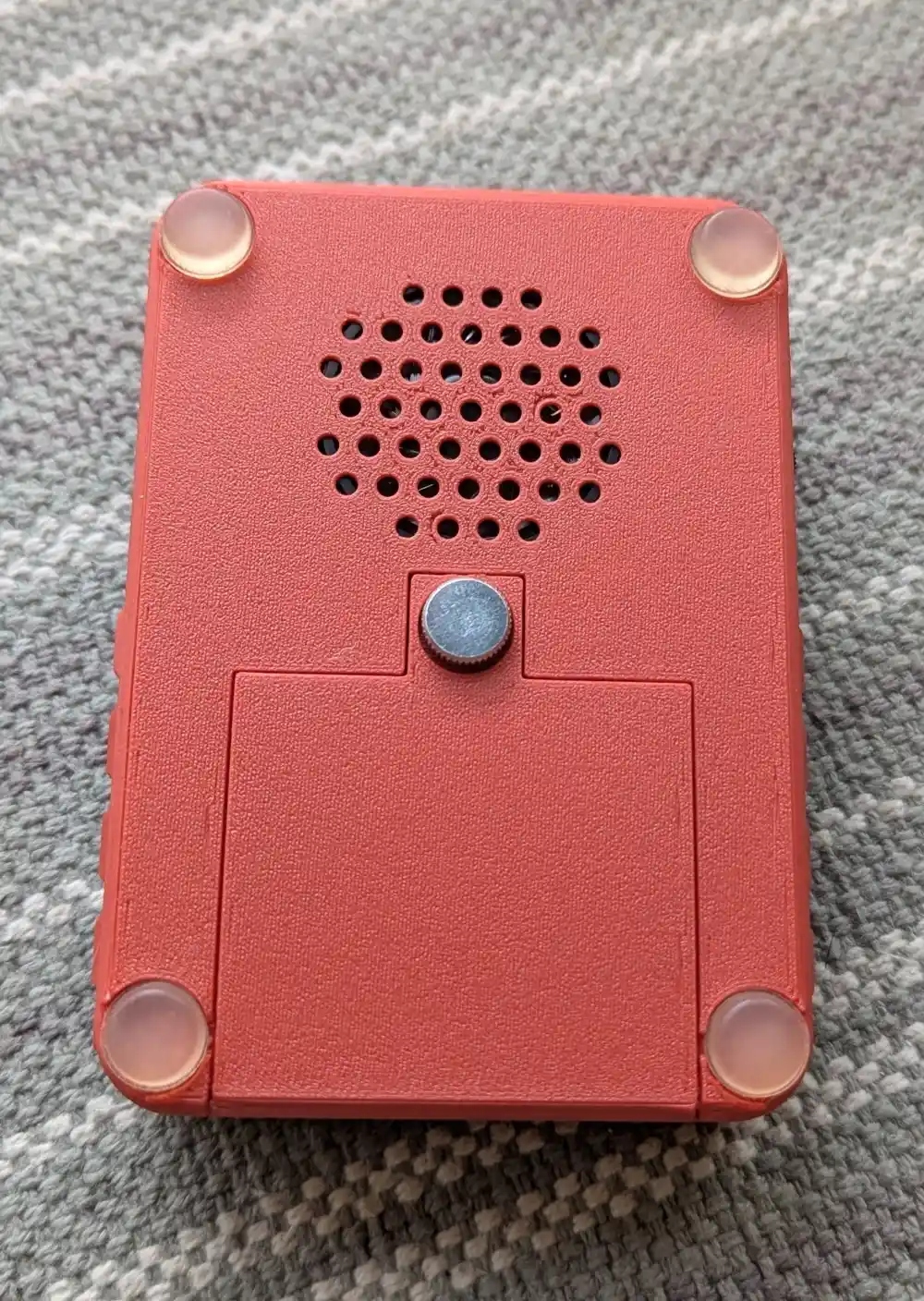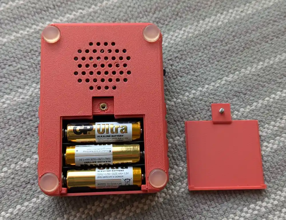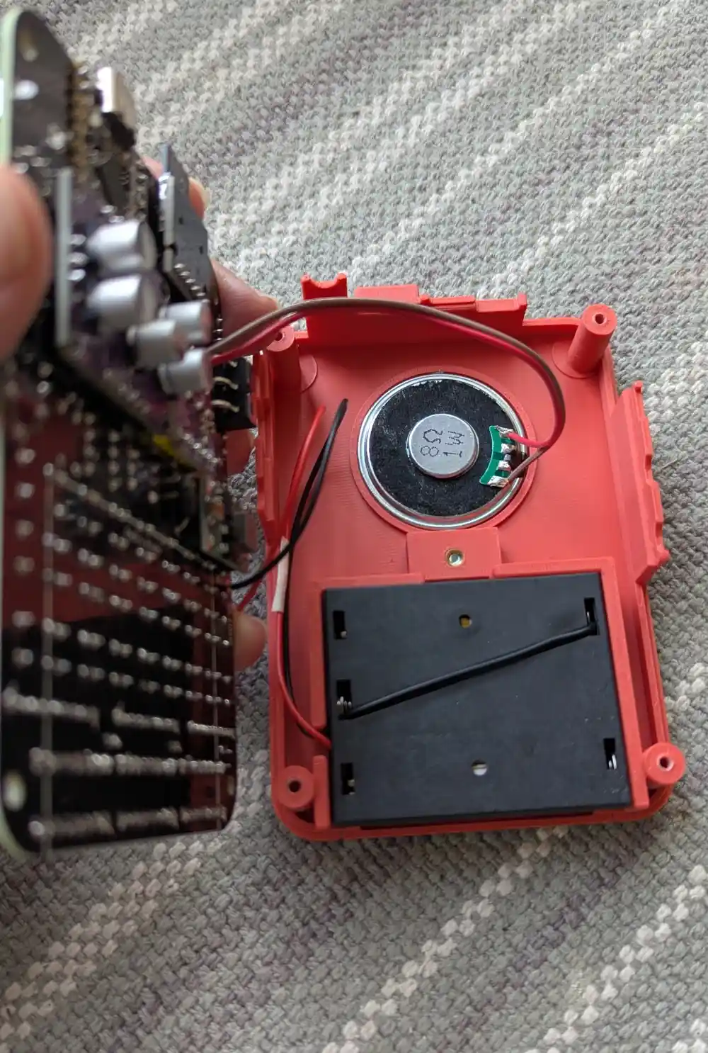Drop the speaker face-down into its hole in the enclosure bottom. I would advise against gluing it in, since the lead is soldered to the PCB. Instead you can use small strips of double sided tape to keep it in place – tiny beads of Prestik (reusable putty) work fine too.