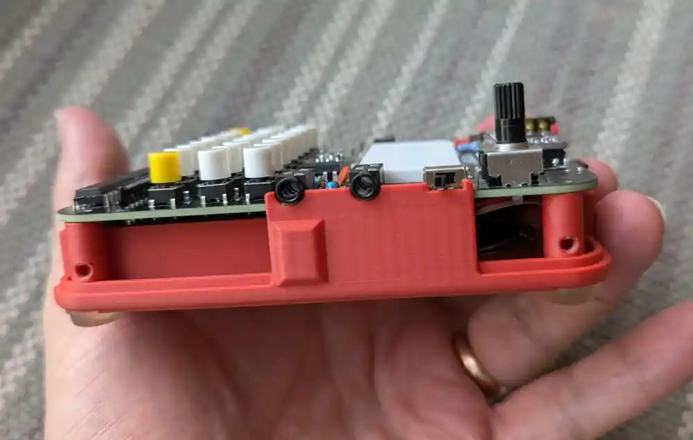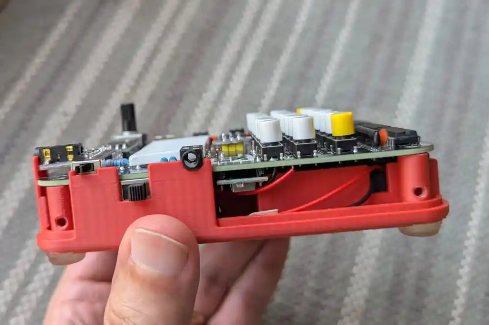Screw in the 4 corner screws so that the PCB is held tight against the standoffs. However, be careful not to overtighten them as the thread can strip – unlike for the battery compartment thumb screw which has a brass insert, the black enclosure screws screw straight into the plastic. In our extensive testing, this is a perfectly reliable solution as long the screws are not overtightened.