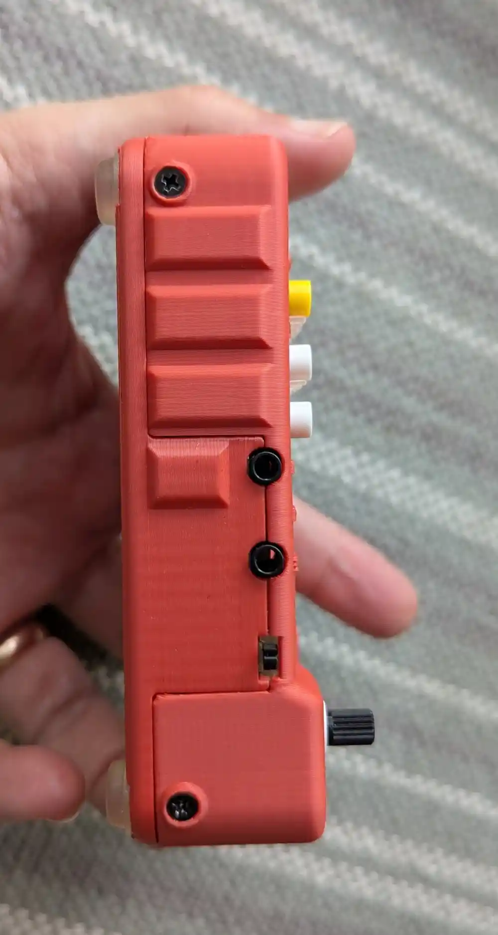 CAUTION: Don’t apply pressure from the sides when the top is not screwed on the bottom. While it’s perfectly robust when everything is screwed in place, the enclosure lacks structural strength when taken apart and can easily crack, especially around the large opening for the neopixel sticks.